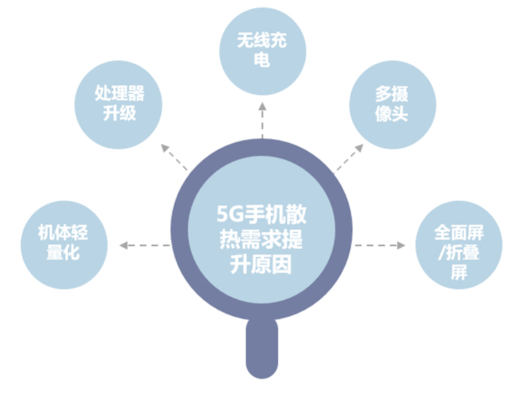 手機(jī)的功耗主要來源于處理器、屏幕、射頻前端、攝像頭模組、電池及充電等模塊。2020年進(jìn)入全面5G時(shí)代以后,5G手機(jī)需要支持更多的頻段和實(shí)現(xiàn)更復(fù)雜的功能,天線數(shù)量翻倍,射頻前端增加,處理器性能提升,同時(shí)智能手機(jī)向大屏折疊屏、多攝高清攝升級、大功率快充升級,功耗提升約是 4G手機(jī)的2.5倍,散熱需求強(qiáng)烈。另外高刷新率成為各品牌旗艦手機(jī)的標(biāo)配,也成為旗艦手機(jī)的重要賣點(diǎn)之一。在一加、OPPO、小米、三星等廠商的推動(dòng)下,高刷新率也成為了用戶的需求熱點(diǎn),為用戶帶來了更細(xì)膩流暢的使用體驗(yàn)。4G手機(jī)散熱以石墨片加熱界面材料為主,僅僅依賴石墨片膜已經(jīng)很難滿足手機(jī)的散熱需求已經(jīng)很難滿足5G手機(jī)的散熱需求。目前市場上主流的5G手機(jī)散熱系統(tǒng)更多使用散熱管和均熱板與導(dǎo)熱界面材料、石墨片相組合的散熱方式 ,帶動(dòng)單機(jī)散熱器件價(jià)值量提升。