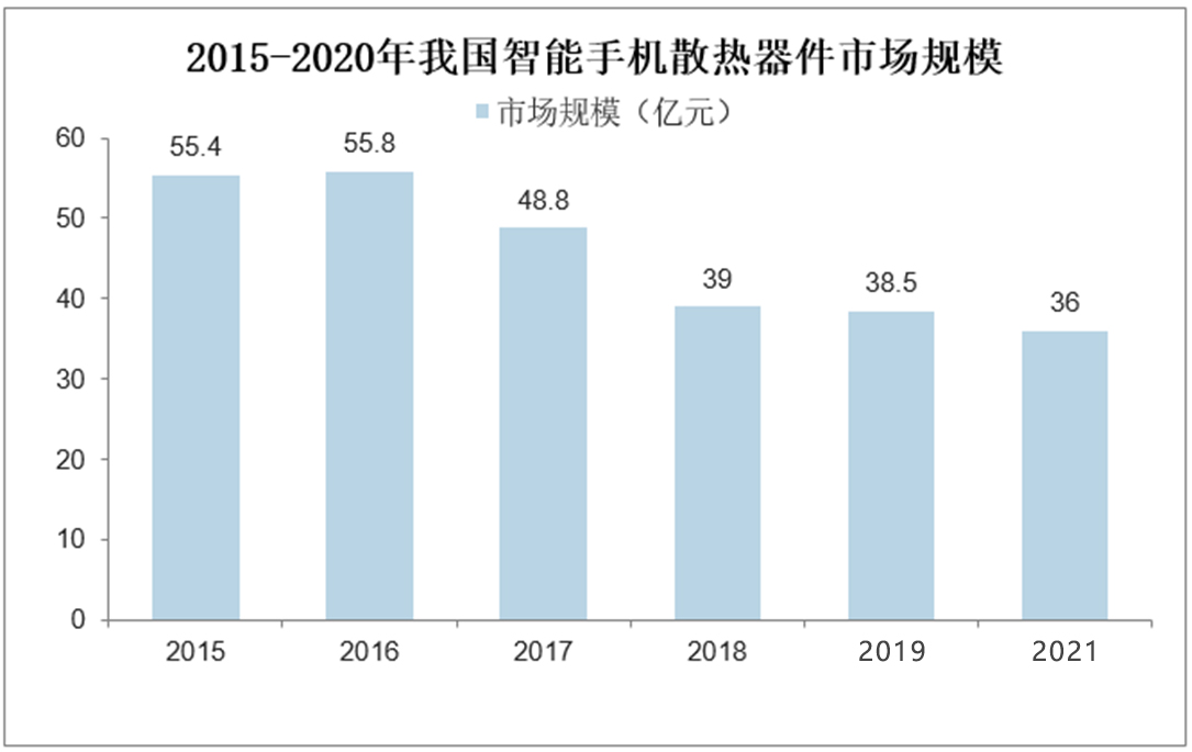 盡管手機(jī)散熱器件的地位越來越重要,但是由于技術(shù)的進(jìn)步,手機(jī)散熱的成本也呈現(xiàn)出逐步下降的趨勢。例如在芯片采用外掛5G基帶的設(shè)計(jì)造成功耗及發(fā)熱更大的背景下,手機(jī)廠商傾向于選擇大容量的電池及更大面積的散熱來應(yīng)對外掛5G基帶帶來的功耗及發(fā)熱提升,而不是進(jìn)一步提升散熱器件的散熱能力。手機(jī)受限于設(shè)備的體積不可能像PC端一樣采取大體積的散熱設(shè)備和更加系統(tǒng)化的散熱設(shè)計(jì),散熱設(shè)計(jì)往往要為更多的新功能讓步,因此國內(nèi)智能手機(jī)散熱器件市場規(guī)模實(shí)際上呈現(xiàn)下降趨勢,2020年由于國內(nèi)手機(jī)出貨量進(jìn)一步下滑,我國智能手機(jī)散熱器件市場規(guī)模約為36億
